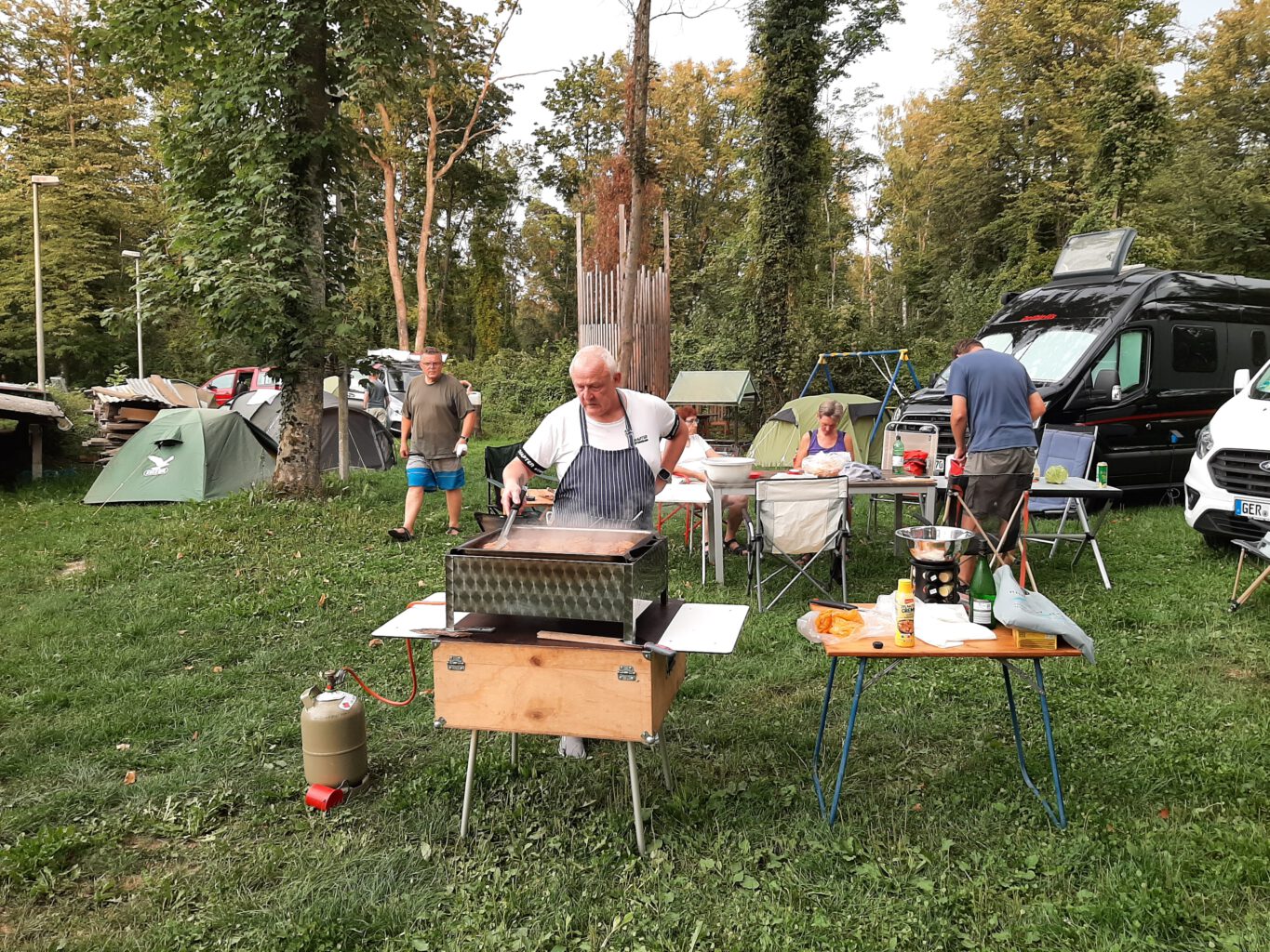 Am 15. August, freitagnachmittags, ging es los nach Rheinau zur DJK WSG Sasbach-Freistett, wo wir übernachten wollten. Ich war schon voller Vorfreude, da ich letztes Jahr bei dieser Tour mit Bernhard auch schon dabei war. Das Wetter war richtig gut, naja ehrlich gesagt fast zu gut, denn es war wirklich drückend heiß. Aber wir wurden zum Glück von Gewittern verschont. Gegen 17 Uhr waren alle eingetrudelt, sodass wir uns überlegen konnten, wer wo am besten sein Zelt aufbaut und wo wir die Wohnmobile parken. Mit von der Partie waren zu dem Zeitpunkt sieben Paddler der KSG und drei Paddler aus Freiburg, die wir teilweise schon vom Paddelwochenende in Rhinau kannten.