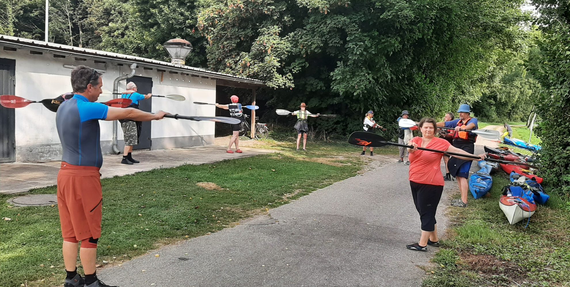 Dann ging es los und zum Glück war es an der Einstiegsstelle in Auenheim noch recht ruhig, so dass wir in aller Ruhe abladen und uns fertig machen konnten. Bevor es aufs Wasser ging, gab es, wie eigentlich immer, wenn man mit Bernhard unterwegs ist, noch eine kleine Gymnastikeinheit zum Aufwärmen, diesmal mit Paddel.