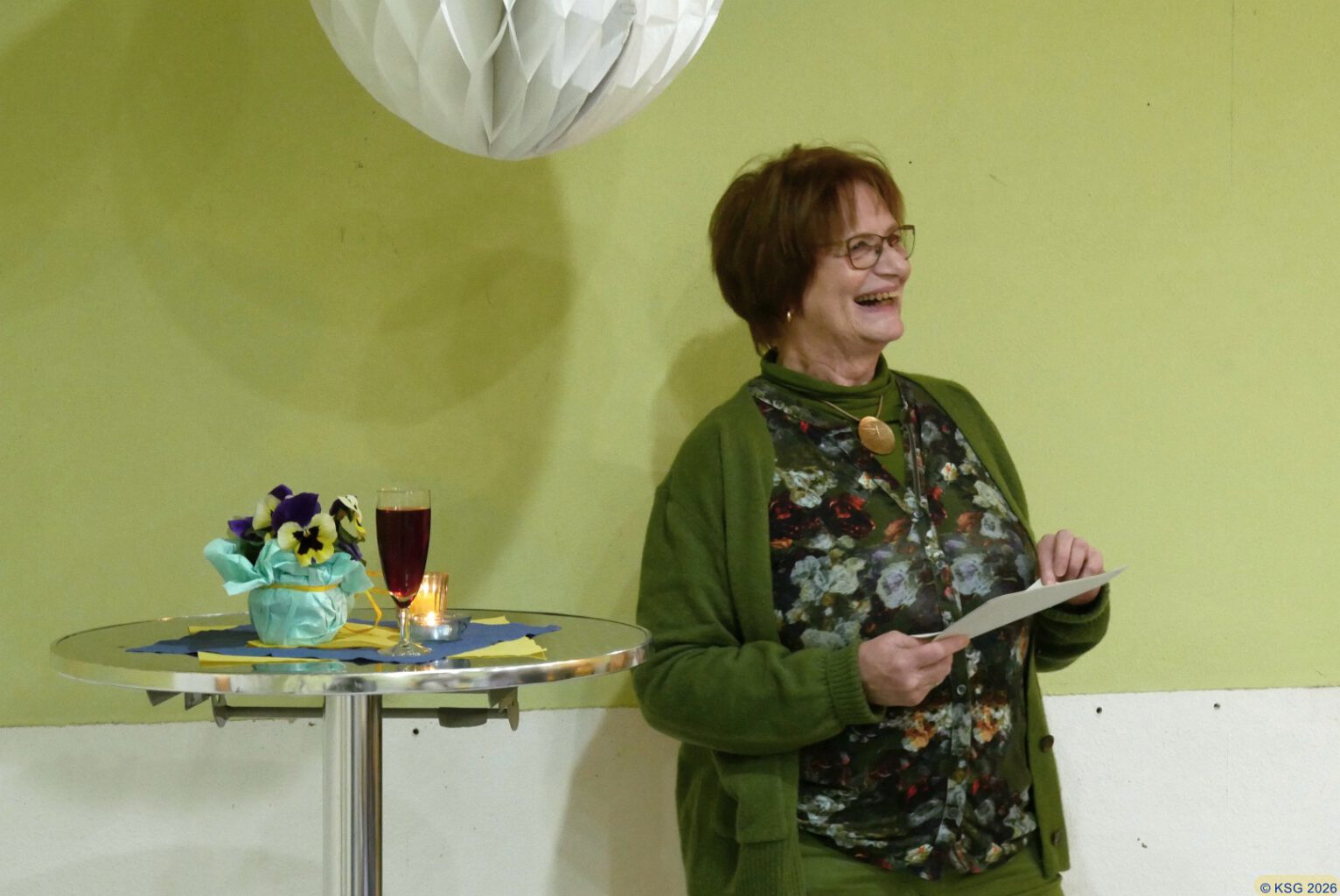 Kurz vor 18 Uhr trudelten die ersten Gäste ein und nach und nach füllte sich der Raum. Mit einem Glas Sekt in der Hand begrüßten wir uns und plauderten bereits angeregt, als Michaela in den Startlöchern stand, um eine kurze Rückschau auf das vergangene und eine Vorschau auf das kommende Jahr zu geben. Die KSG wird in diesem Jahr 60 Jahre alt, und so zeichnete sie im Schnelldurchlauf die Entwicklung der KSG von 1966 bis heute nach, nicht ohne einen freundlichen Aufruf zu etwas mehr „Gründermentalität – Ärmel hoch krempeln“.