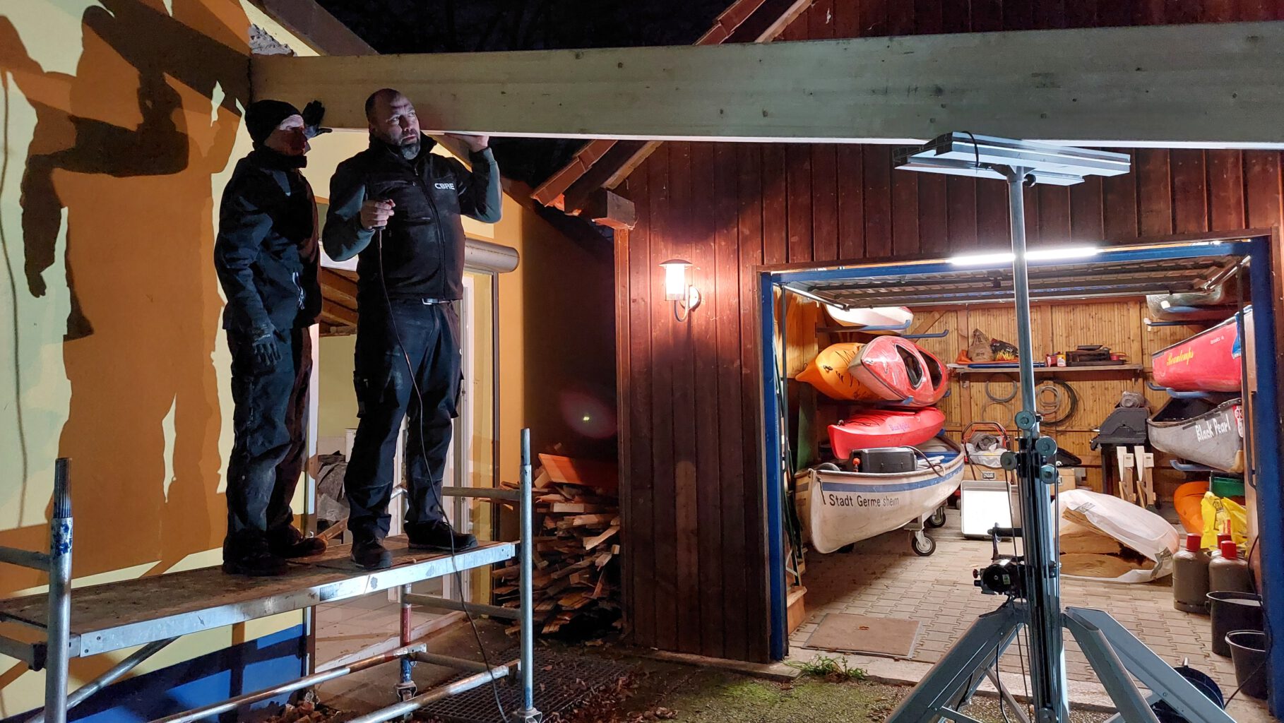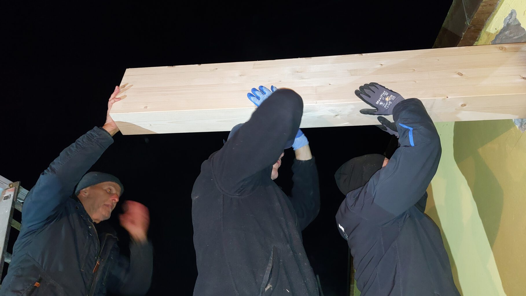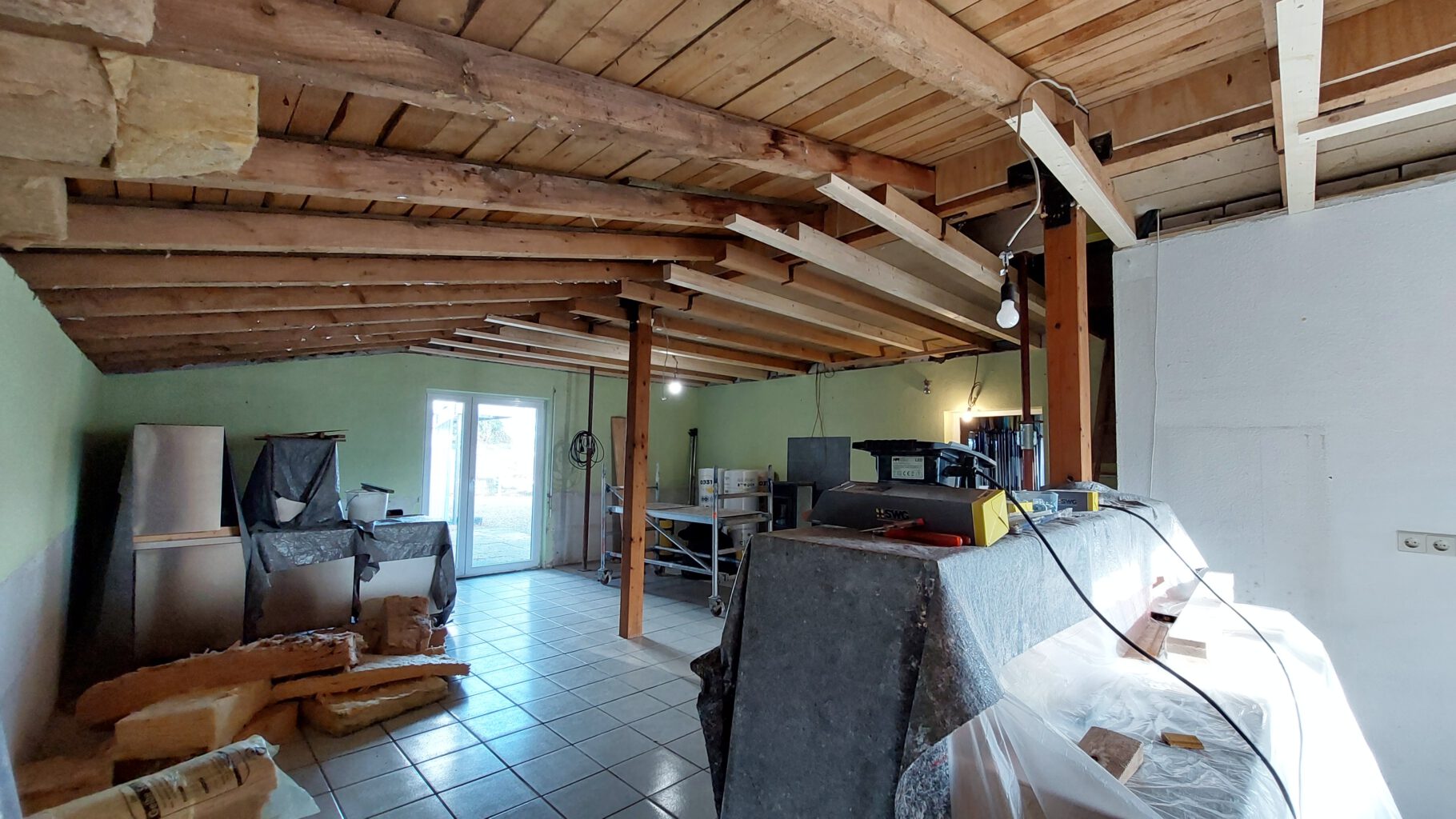 In diesem Zuge konnte (nachdem Uwe grünes Licht gegeben hatte) auch eine störende Stütze im Gastraum entfernt werden, wodurch der Raum deutlich offener und großzügiger wirkt. Unsere KSG Handwerker haben hier richtig geschuftet, um den riesigen Stützbalken zu montieren.