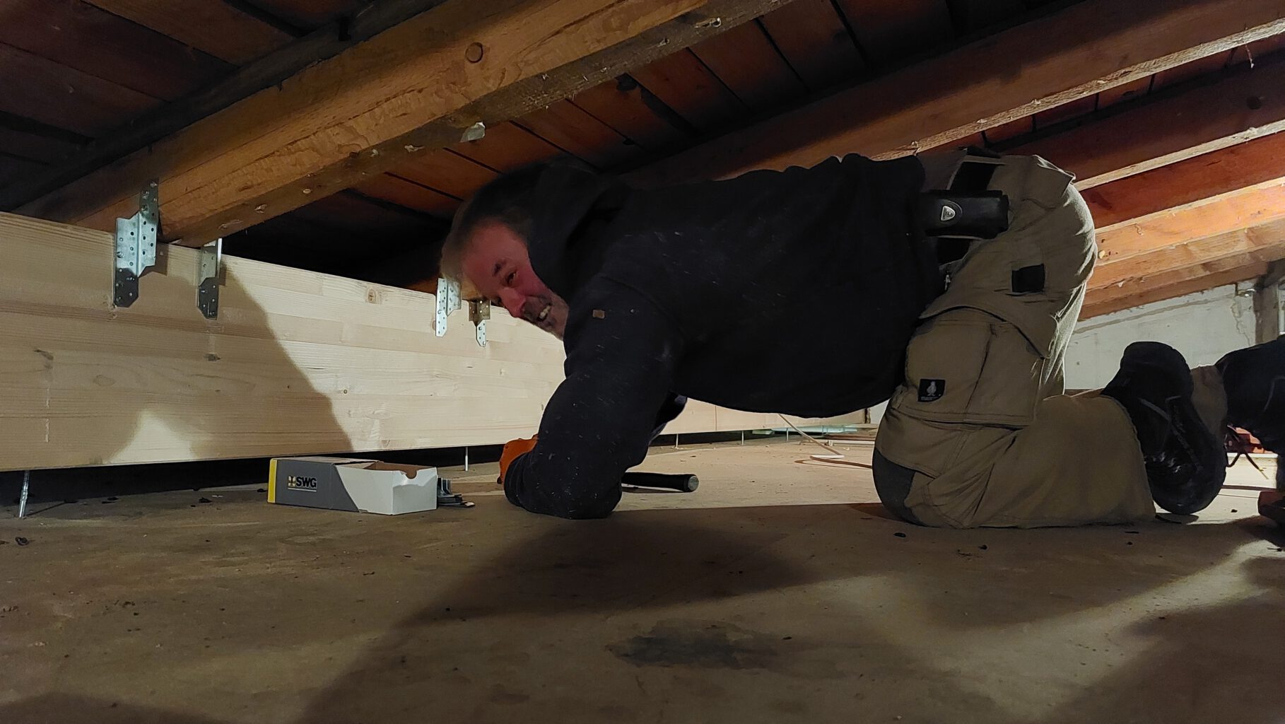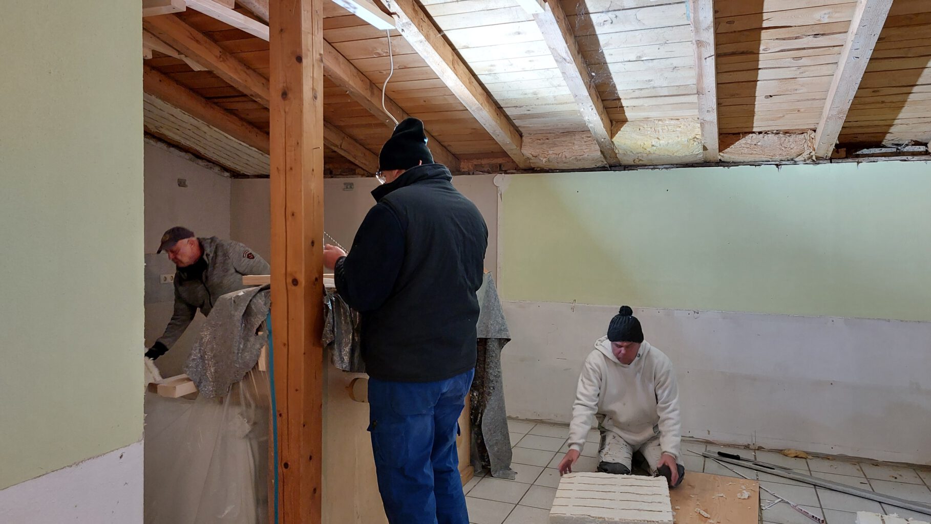 Zu Beginn der Maßnahmen wurde die alte Decke vollständig entfernt (obwohl unser Statiker Uwe gewarnt hatte: das ist ein Haufen Arbeit…). Im Anschluss erfolgte die konstruktive Renovierung der Decke: Das vorhandene Konstruktionsholz wurde ergänzt und teilweise aufgedoppelt, um die Tragfähigkeit zu erhöhen. Zusätzlich wurden Auflager für einen neuen Überzug betoniert. Dieser Überzug wurde anschließend eingebaut und dient nun dazu, die Deckenbalken zuverlässig abzufangen.