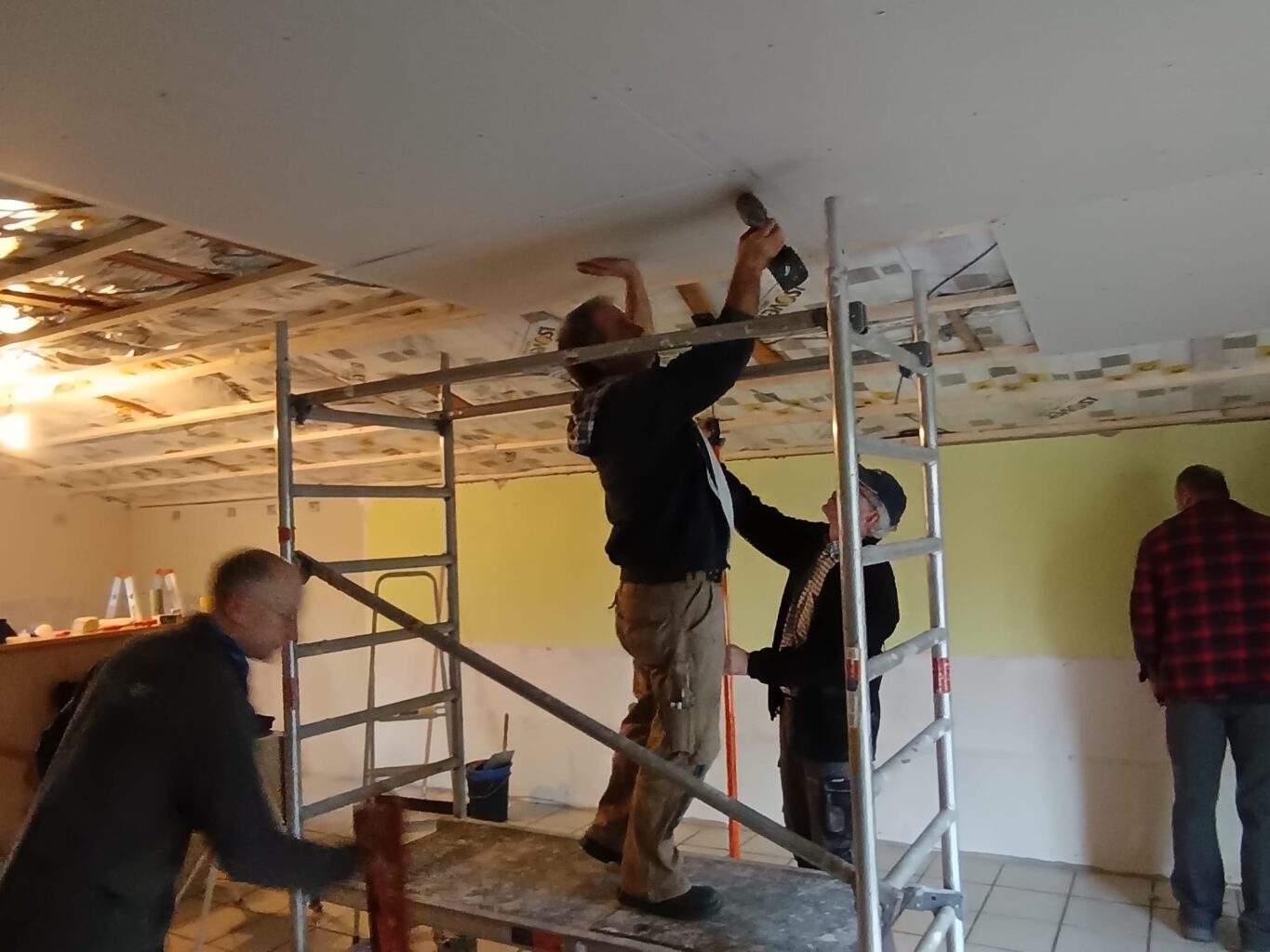 Ein weiterer Schwerpunkt lag auf der energetischen Verbesserung. Die Sparrenfelder wurden mit einer Dämmstoffstärke von 140 mm ausgedämmt. Danach wurde eine Dampfbremsfolie fachgerecht montiert und sorgfältig verklebt, um die Konstruktion dauerhaft vor Feuchtigkeit zu schützen. Für den Innenausbau wurde eine Unterkonstruktion aus Dachlatten montiert und exakt ausgerichtet. Parallel dazu erfolgte die Verlegung neuer Elektroinstallationen für die Beleuchtung, zusätzliche Steckdosen sowie die Nutzung eines Beamers.