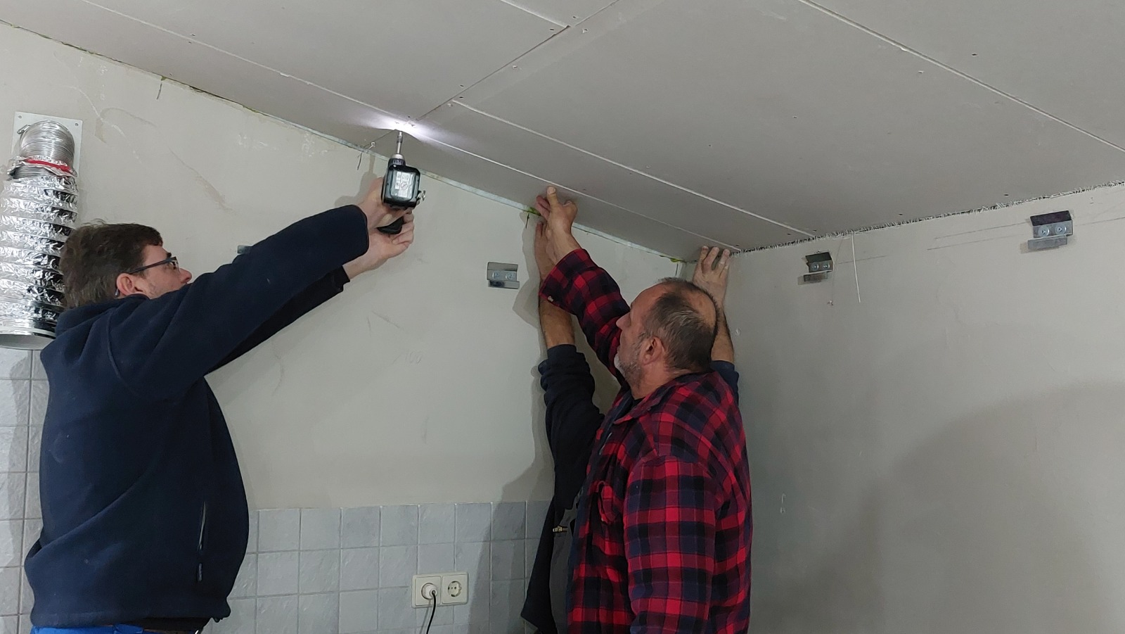 Im nächsten Schritt wurde die Decke mit Gipskartonplatten verkleidet und sauber von Michael verspachtelt. Anschließend erfolgte die Grundierung mit Tiefengrund sowie ein zweifacher weißer Anstrich, der für ein helles und freundliches Erscheinungsbild sorgt. Abschließend wurden noch vorhandene Löcher in den Wänden geschlossen und sämtliche Wandflächen frisch gestrichen.