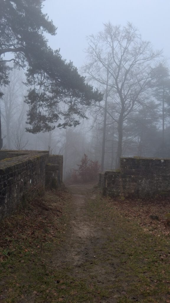 Auf dem Weg dorthin kamen wir auch an einem Aussichtspunkt vorbei, von dem man sicherlich einen schönen Ausblick ins Tal und in die Rheinebene hat, was uns leider an diesem Tag wegen des zähen Nebels missgönnt wurde.